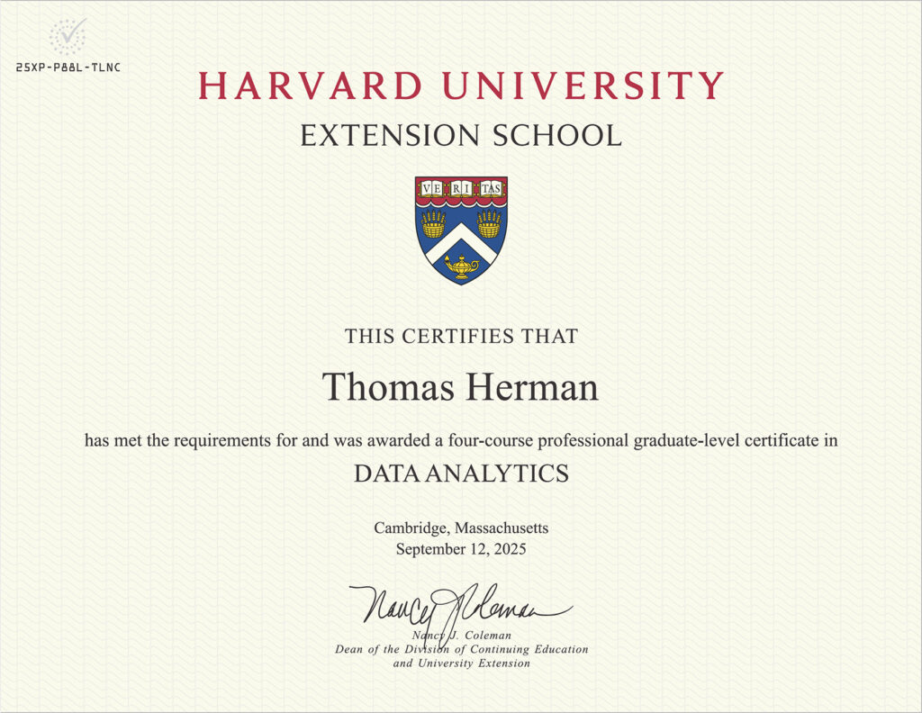 I recently obtained a Data Analytics Graduate Certificate from Harvard Extension School